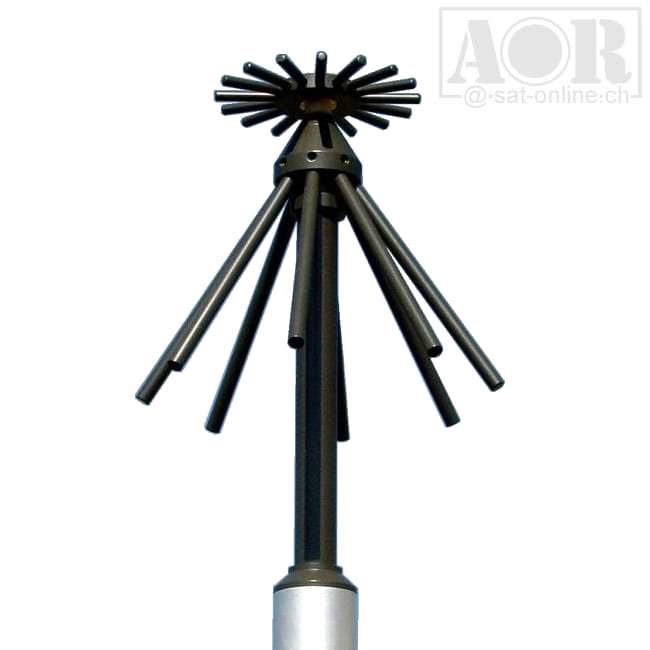 Die AOR DA6000 ist eine professionell gefertigte Scannerantenne im kompakten Discone-Design. Sie eignet sich für den Empfang im breiten Frequenzbereich von 700 MHz bis 6 GHz, darunter UHF, L-, S- und C-Band. Die Antenne besteht aus einem oberen Segment mit 16 horizontalen Elementen (Ø 82 mm) sowie 8 Radials im unteren Bereich (je 100 mm lang).