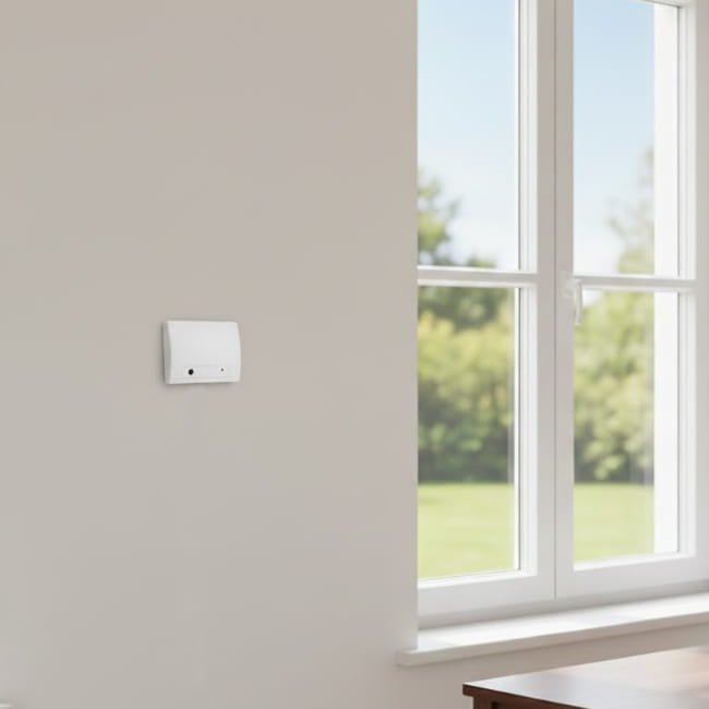 Son fonctionnement sans fil facilite une installation rapide sans câblage ni alimentation externe. Il suffit de le fixer en face de la surface vitrée à surveiller.