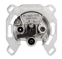 Die Antennensteckdose RV 600-10 E verfügt über eine integrierte Elektronik und erfüllt die europäischen Normen EN 50083-1 und EN 50083-2. Aufgrund ihres zweifachen Gleichspannungsdurchlasses (doppelter DC-Bypass) ist sie die ideale Reihenverteilkomponente in TechniRouter-Systemen.