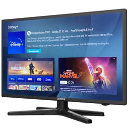 TV mit 24" Bildschirmdiagonale im 16:9 Format, der neben herkömmlichem Fernsehen auch das Streamen von Filmen und Serien über das Internet ermöglicht. Er kann mit 12V DC (3A), 24V DC (1,5A) oder 100 - 240V AC (50/60Hz) betrieben werden und verfügt über einen Triple-Tuner (DVB-S2/DVB-C/DVB-T2), sowie eine vorprogrammierte Deutsche Senderliste und einen elektronischen Programmführer (EPG). Per WLAN oder LAN-Kabel (RJ45) kann er über einen Router mit dem Internet verbunden werden, um mittels installierter Apps Inhalten von bekannten Mediaportalen oder den Mediatheken von ARD und ZDF zu streamen. Weitere Ausstattungen und Anschlüsse sind ein CI+ Steckplatz, Bluetooth 4.2, PVR Recording, 2 HDMI-Anschlüsse (z. B. für den Anschluss einer Soundbar oder Spielekonsole), CVBS out, Line out, Coaxial out, AV in, 2 USB-Anschlüsse (inkl. Mediaplayer) und Headsetanschluss. Der Bildbetrachtungswinkel beträgt 178° horizontal / 178° vertikal, der Kontrast 4000:1 und die Bildschirmhelligkeit 200cd/m2. Das Display kann 16,7 Millionen Farben darstellen. Im Lieferumfang befindet sich ein 12/24 Volt DC-, sowie 100-240 Volt AC Netzteil, eine Infrarot Fernbedienung inkl. Batterien und ein Standfuss. Die Montage des Fernsehers ist auch an einer Vesa-Halterung möglich (10 x 10 cm).