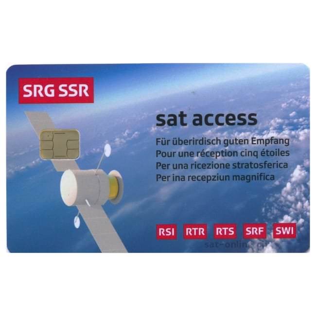 Tessera (Smardcard) ufficialle Sataccess della SRG SRF per i canali svizzeri via satelite in criptaggio Viaccess per la riccezzione illimitata dei programmi televisivi e radio listati.