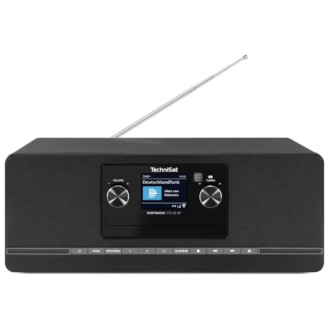 TechniSat DIGITRADIO 372 CD BT ist ein vielseitiges Musiksystem für das Wohnzimmer, das durch klaren Stereoklang und ein breites Funktionsspektrum überzeugt. Zwei integrierte Lautsprecher mit jeweils 5 Watt sorgen für einen satten, ausgewogenen Sound. Ob digitale Radiosender via DAB+, klassisches UKW, CDs oder kabelloses Bluetooth-Streaming – dieses System bietet flexiblen Musikgenuss in einem eleganten Gehäuse. Dank einfacher Bedienung, grossem Farbdisplay und praktischen Weckfunktionen ist das DIGITRADIO 372 CD BT eine ideale Komplettlösung für den täglichen Audiogenuss.