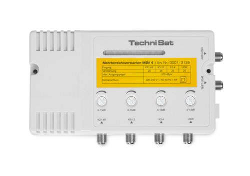 Der TechniSat Mehrbereichsverstärker MBV 4 eignet sich aufgrund seiner technischen Werte optimal zum Einsatz in mittleren und grösseren Antennenverteilanlagen. Das Gerät verfügt über vier Eingänge. An einem kombinierten Ausgang liegt das komplette Antennensignal an. Die Verstärkung des MBV 4 liegt zwischen 26 und 28 dB (je Eingang). Da es in der Praxis sehr oft vorkommt, dass die Eingangspegel der angebrachten Antennen unterschiedlich sind, ist der MBV 4 mit jeweils einem Pegelsteller pro Eingang ausgerüstet. Hierdurch besteht die Möglichkeit, den Eingangspegel stufenlos um 0 bis 18 dB abzudämpfen. Wie der Mehrbereichsverstärker MBV 3, verfügt auch dieser Mehrbereichsverstärker MBV 4 über ein integriertes Netzteil.