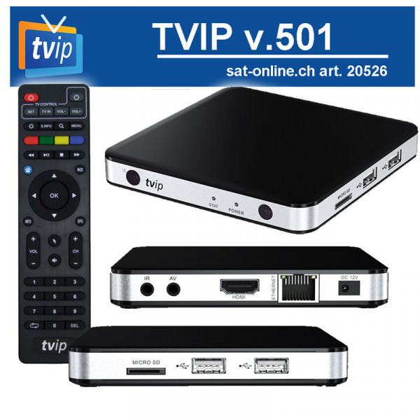 Im gegensatz der 500er hat die TVIP 501 doppelt soviel Speicher und wird mit eingebautem WiFi 802.11 (b/g/n) von Satonline geliefert.