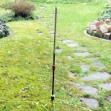 Der 5.60 m lange Teleskopstrahler lässt sich dank Markierungen leicht auf die richtige Länge einstellen. Für das 40 m Band wird eine Zusatzspule verwendet. Die Abstrahlung erfolgt als Groundplane mit drei 3.5 m langen Radials und einem stabilen Erdspiess mit PL-Anschluss.