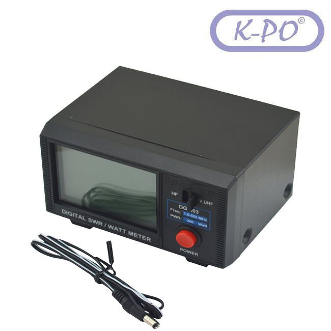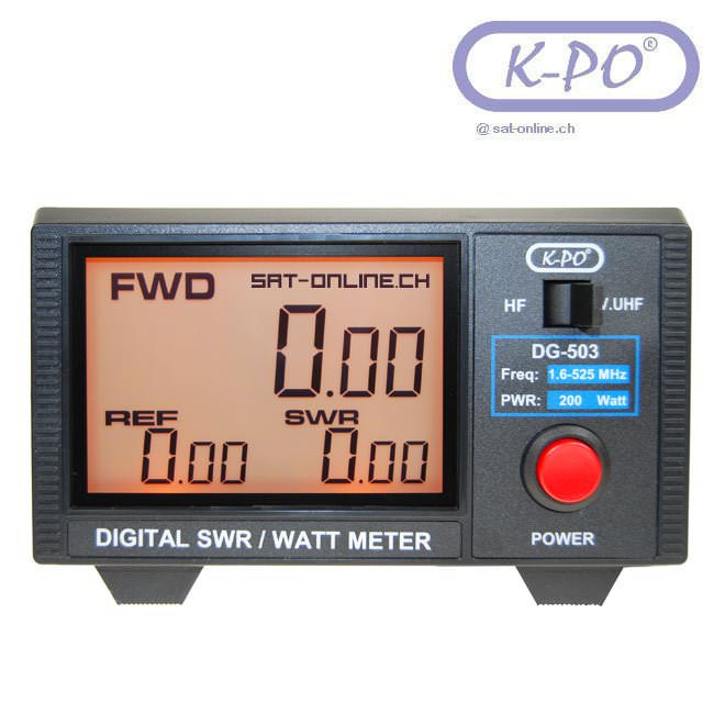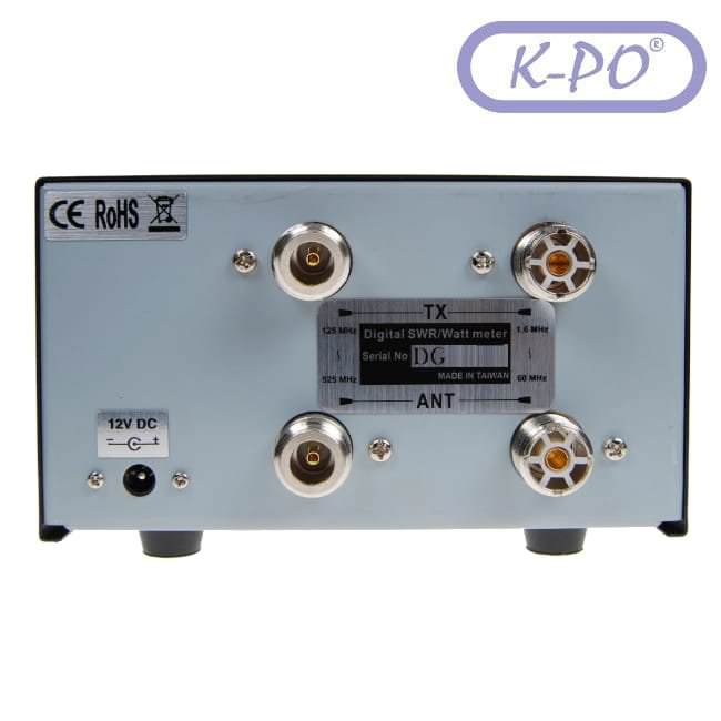 Marke K-PO für 1,6-60 MHz und 125-525 MHz und bis 200 Watt Sendeleistung. Die Zusatzbezeichnung "N" steht für N-Buchsen im UHF/VHF Beteich. Es besitzt zwei getrennte Messbereiche mit Umschalter für den HF und den (VHF/UHF) Bereich. Über die 12 Volt DC-Buchse wird das LC-Display mit Hintergrundbeleuchtung gespeist.