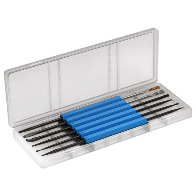 Lötwerkzeug-Set ist ein unverzichtbares Hilfsmittel für jeden Elektronik-Arbeitsplatz. Ob zum Entfernen von Korrosion mit den Schabern, zum Reinigen von Platinenlöchern mit der Reibahle oder zum präzisen Greifen von Drähten mit der Gabel – dieses Set deckt alle gängigen Arbeitsschritte ab. Dank der nicht-magnetischen Beschichtung bleiben keine Metallteile ungewollt an den Spitzen haften, was das Platzieren von Bauteilen massiv erleichtert. Die kompakte Länge von ca. 18 cm sorgt für eine optimale Handhabung wie bei einem Stift.