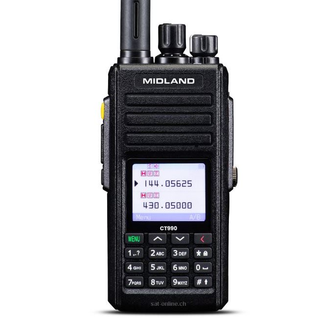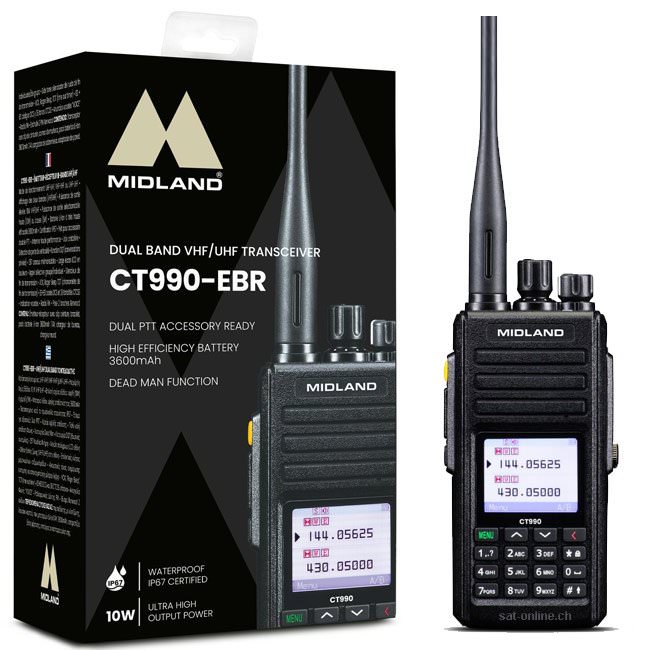 Das MIDLAND CT990-EBR ist ein portables Dual Band Amateurfunkgeraet und extrem leistungsstark mit einer hohen Ausgangsleistung von 10 W VHF/UHF. Seine Zertifizierung nach IP67 garantiert hohe Zuverlaessigkeit und bietet umfassenden Schutz vor Staub sowie Eintauchen in Wasser bis 1 m / 30 Minuten. Satonline ist offizieller Schweizer Midland Distributor – Originalgeraete, Garantie und Service.