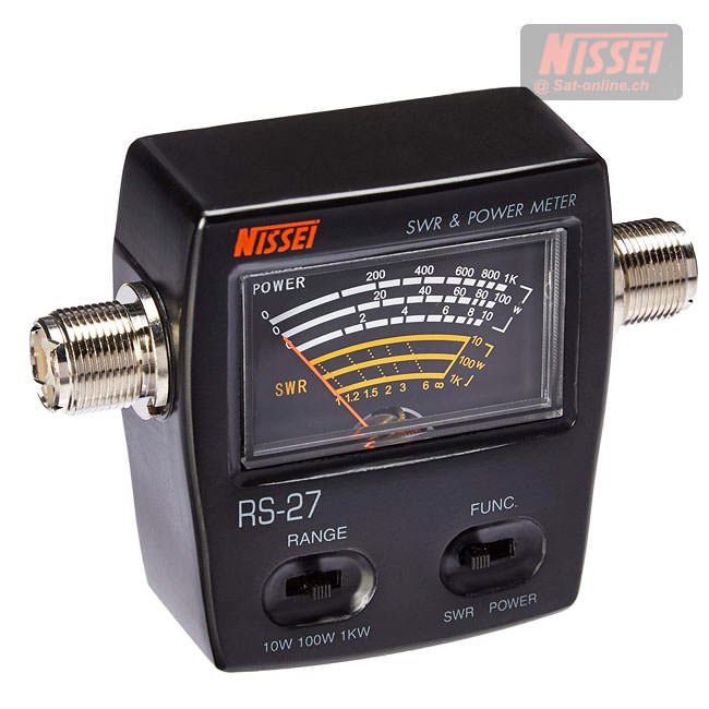 Das Nissei RS-27 SWR / Wattmeter ist klein und ermöglicht die Messung des SWR (Stehwelle) von den Frequenzen 26 bis 30 MHz und einer Ausgangsleistung von bis zu 1000 W (1 kW).