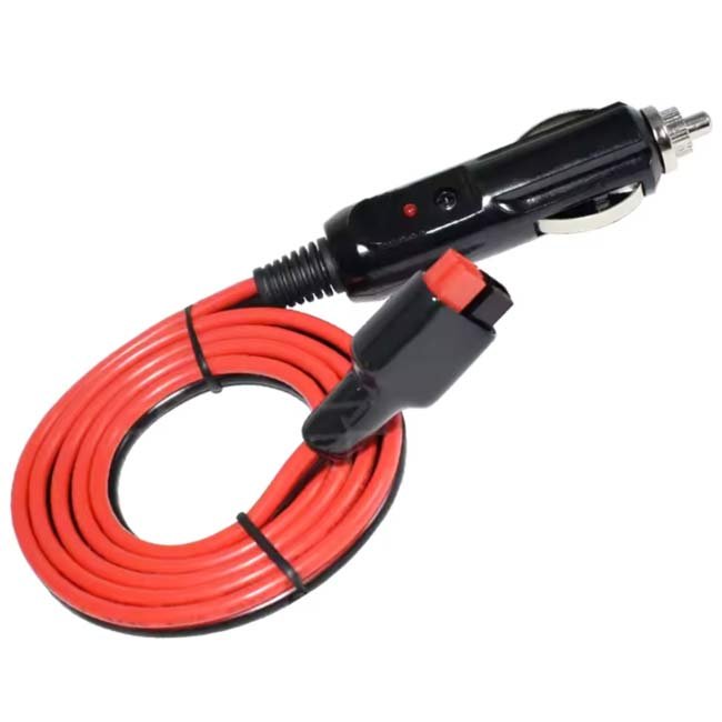 Das Kabel besitzt auf einer Seite einen Anderson Powerpole 30-A-Stecker (Rot = Plus, Schwarz = Minus) und auf der anderen Seite einen Zigarettenanzuender-Stecker mit integrierter 15-A-Sicherung. Eine rote LED-Anzeige signalisiert die anliegende Versorgungsspannung.