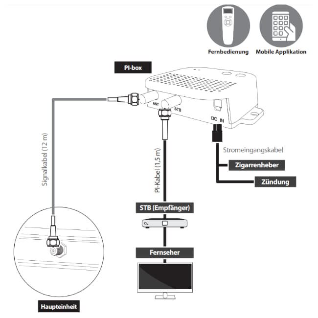 Dank der iOS und Android App zur Steuerung und Aktualisierung der Antenne, wird nur noch ein RF Kabel für die Installation benötig. Ein zusätzlicher Controller ist nicht mehr nötig.