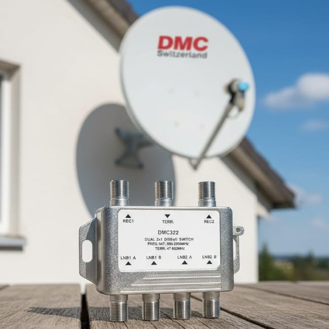 Der DMC DiSEqC 5/2 Schalter Typ DMC 322 dient zum Anschluss von zwei LNBs an zwei Receiver oder alternativ an einen Receiver mit Twin-Tuner. Er eignet sich für Multisatelliten-Konfigurationen mit Twin-LNBs, zum Beispiel für den gleichzeitigen Empfang von Astra und Hotbird.