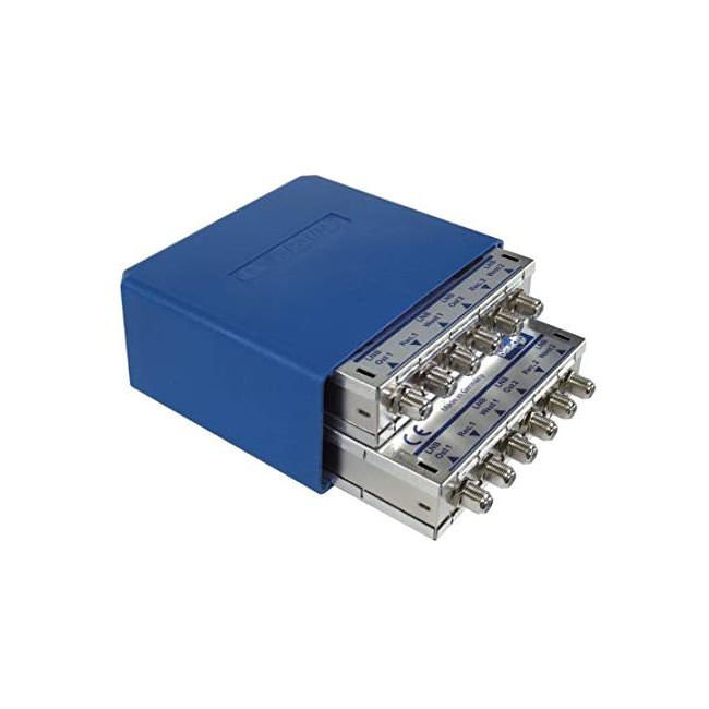 DiSEqC Switch zum Zusammenführen von zwei Quad LNBs auf vier Receiver mit Wetterschutzgehäuse. Für zwei Satellitenpositionen, z.B Astra und Hotbird, auf vier Teilnehmer.