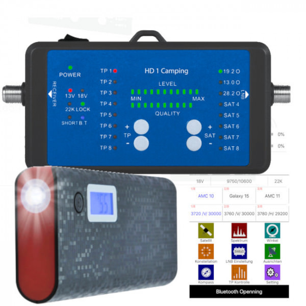 Dank mitgelieferter 10000 mAh Powerbank lässt sich das Messgerät unabhängig vom Receiver verwenden. Gleichzeitig lässt sich die Powerbank auch als mobile Ladestation für Ihr Smartphone oder andere Geräte verwenden. Zusätzlich ist in die Powerbank noch eine Taschenlampe integriert, sodass die Ausrichtung der Antenne auch bei schlechten Lichtverhältnissen problemlos möglich ist.