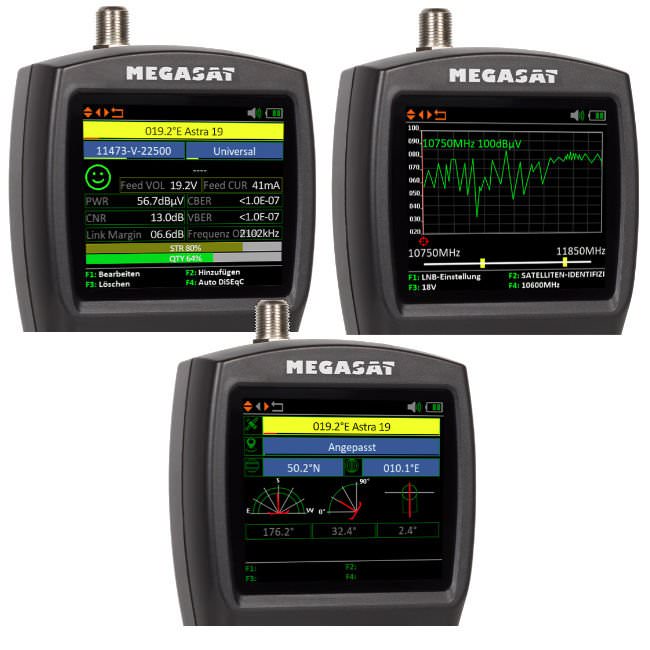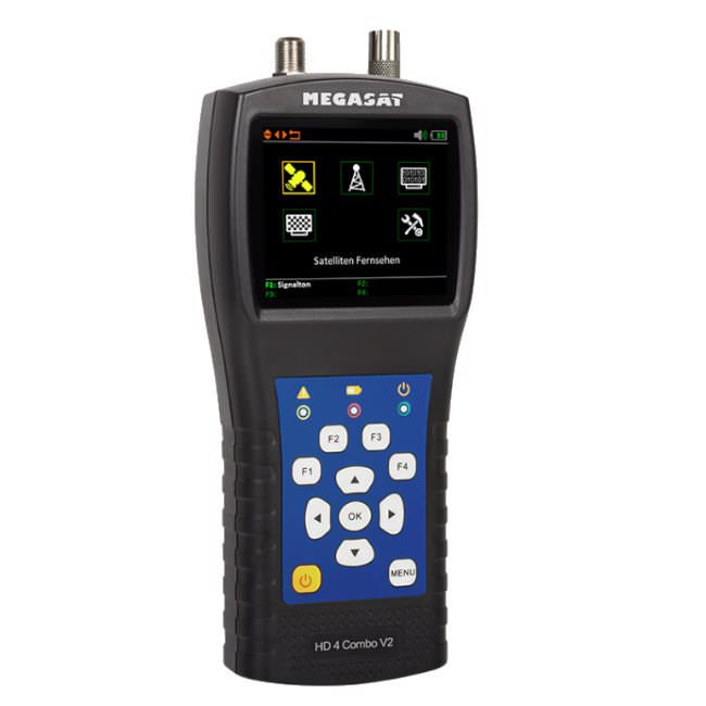 Megasat können alle digitalen Empfangssignale (Satellit, Kabel und Terrestrisch) ausgemessen werden. Das 2.7 Zoll grosse Display zeigt alle wichtigen Angaben übersichtlich an und bietet eine einfache Bedienung. Das HD 4 Combo V2 verfügt über ein Echtzeit Spektrum zur Fehleranalyse, DiSEqC Messungen sowie eine Winkelberechnung für die Winkeleinstellung von Sat Antennen.