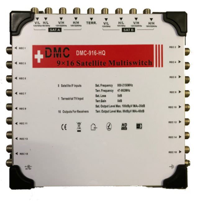 Mit dem DMC-Swiss 9/16  Multischalter können Signale 2-er Sat-Positionen (z.B. Astra + Hotbird) unter 16 Sat-Receiver gleichzeitig genutzt werden.