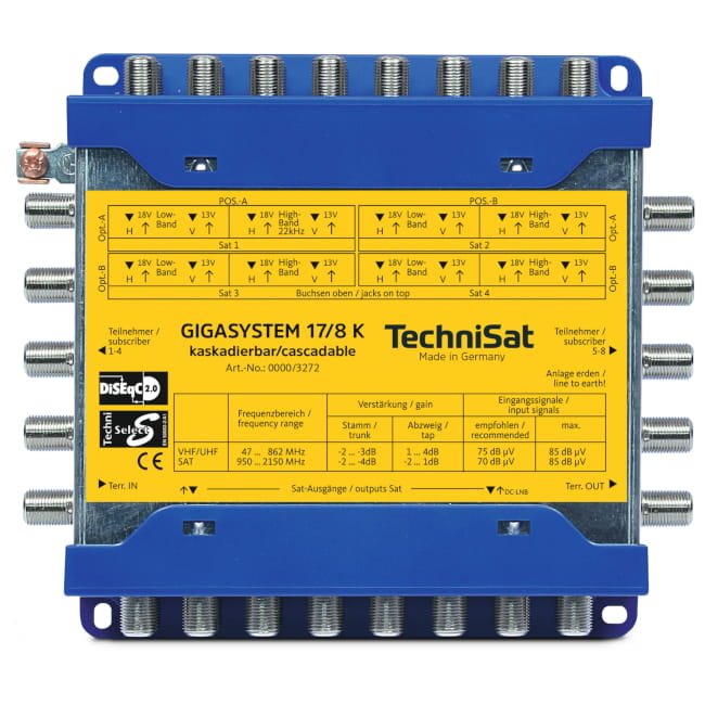 Die TechniSat 17/8 K Kaskade ist Teil des leistungsstarken GigaSystem 17/X und dient als Erweiterung eines bestehenden GigaSystem 17/8 G Multischalters. Sie verteilt 16 Sat-ZF-Ebenen (für z. B. 4 Satelliten mit je 4 Ebenen) plus ein terrestrisches Signal auf 8 Teilnehmeranschlüsse.