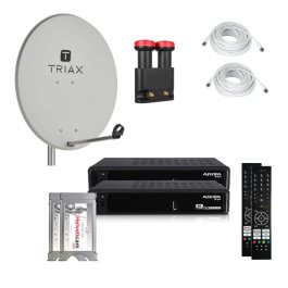Dieses Sat-Set für 2 Teilnehmer bietet alles, was Sie für den Empfang von Satellitenfernsehen in 4K-Qualität benötigen – Ideal für Zuhause oder als hochwertige Lösung im Ferienhaus.
