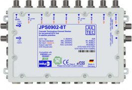 Beim Jultec JPS0902-8T handelt es sich um einen Unicable Multischalter für zwei Satellitensysteme (im Breitbandmodus vier Sat-Systeme). Das Gerät versorgt sich komplett aus den angeschlossenen Empfangsgeräten, für die Speisung des LNBs ist ein externes Netzteil erforderlich (z.B. JNT19-2000)
