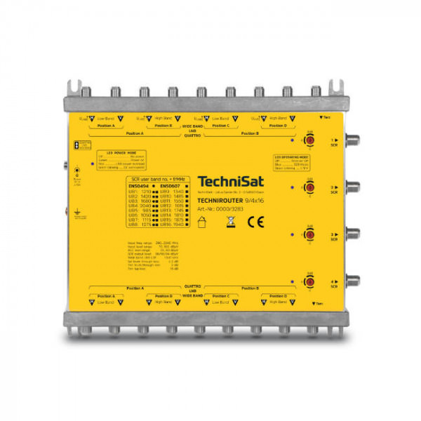 Unicable Router und versorgt bis zu 64 Teilnehmer mit den kompletten Fernsehprogrammen von bis zu 4 Satelliten (z. B. von Astra 19,2°E, Hotbird 13°E, Astra 23,5°E und Astra 28,2°E) sowie dem terrestrischen Signal über ein Kabel. Dabei lassen sich bestehende Kabelstrukturen in Wohnungen oder Gebäuden ohne neue Kabelverlegung nutzen. Werden mehr als 64 Teilnehmeranschlüsse benötigt, dann können weitere TECHNIROUTER 9/4x16 an den Stammleitungs-Ausgängen kaskadiert werden.