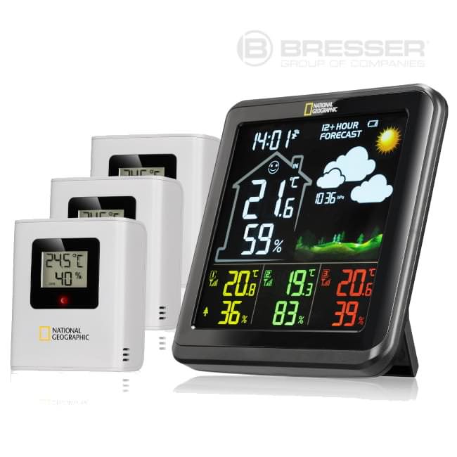 Die National Geographic VA Wetterstation bietet eine umfassende Übersicht über Temperatur- und Luftfeuchtigkeitswerte mit vier Messpunkten – sowohl innen als auch aussen. Dank des klar strukturierten Farbdisplays lassen sich alle relevanten Wetterdaten auf einen Blick erfassen. Das Set enthält drei Aussensensoren sowie einen integrierten Innensensor.