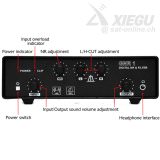 Xiegu GNR1 unterstützt einen externen passiven Lautsprecher und bietet eine Audioausgangsleistung von 3 Watt. Unabhängige Anpassung der Eingangs- und Ausgangs-Audiopegel, Auswahl von hoher oder niedriger Eingangsimpedanz, Unterstützung von zwei Audioausgängen (3,5-mm-Stereoausgang, Cinch-Ausgang), Kopfhörerausgang und automatische Umschaltung von Kopfhörer- oder Lautsprecherausgang.